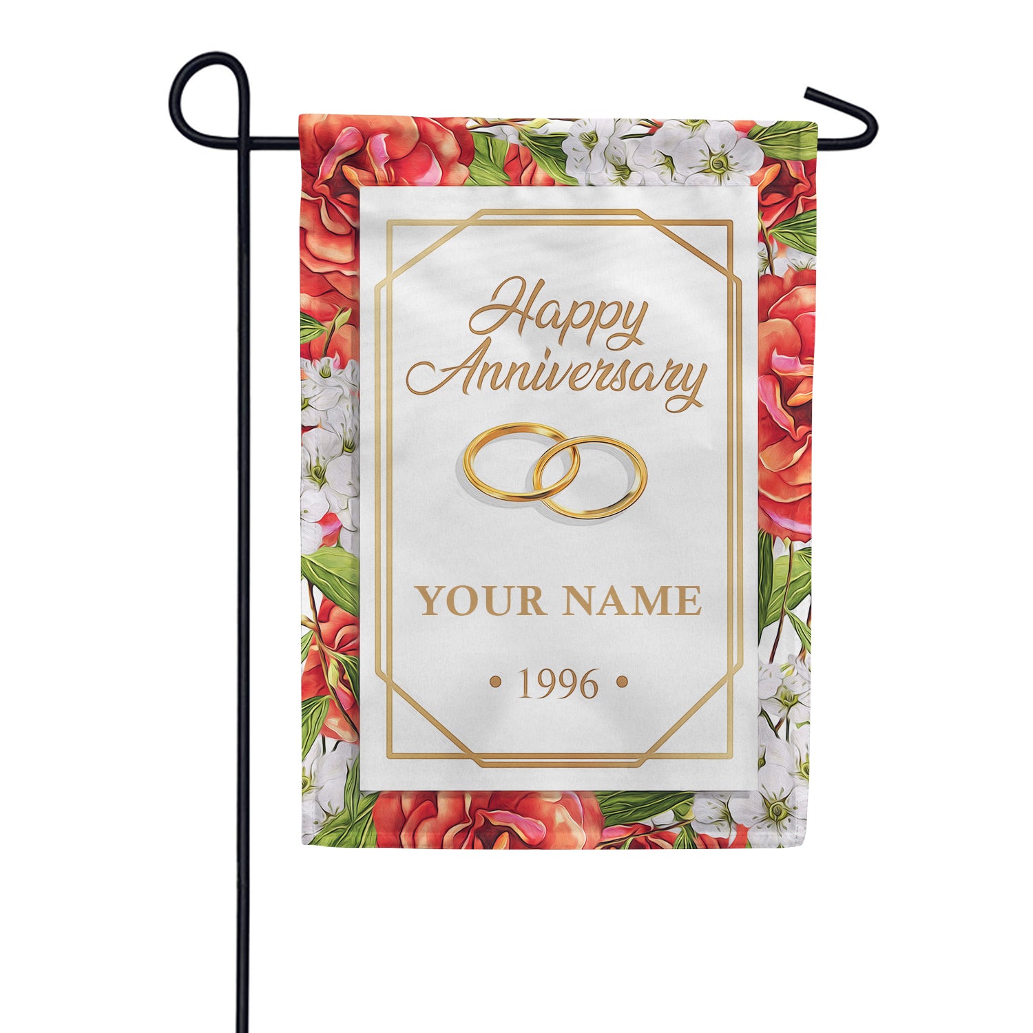 We're obsessed with this anniversary flag! 💕 That "Happy Anniversary" message with wedding rings and your names plus lovely flowers creates such romantic celebration. Perfect for milestone moments! 💍