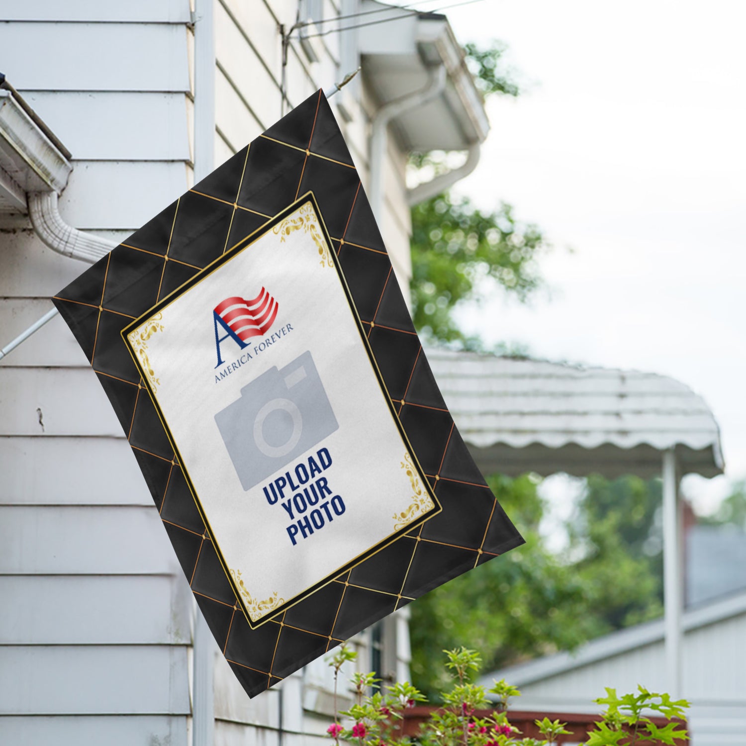 This royal design is perfect for showcasing your favorite photo! 👑 Featuring a rectangular frame with floral ornaments for your picture on a quilted black and gold background. Upload your image and add your message for something truly special! ✨