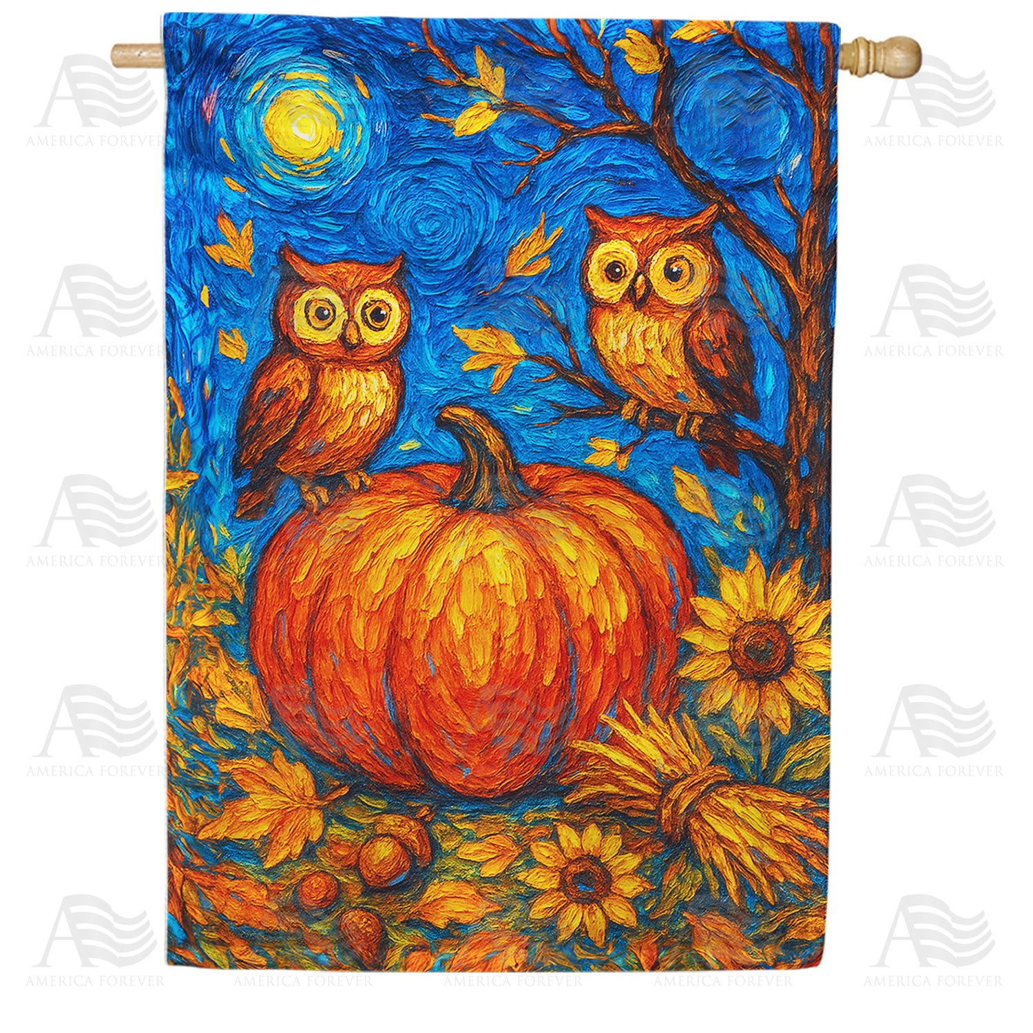 This artistic masterpiece is giving us ALL the fall feels! 🦉✨ Inspired by Van Gogh's iconic style, this stunning design features two gorgeous owls perched under a swirling starry night sky with a beautiful glowing pumpkin and golden sunflowers! Those rich blues, oranges, and yellows with thick brushstroke textures create such a unique harvest scene. Your neighbors are gonna stop and stare at this artistic beauty! 🎃🌻