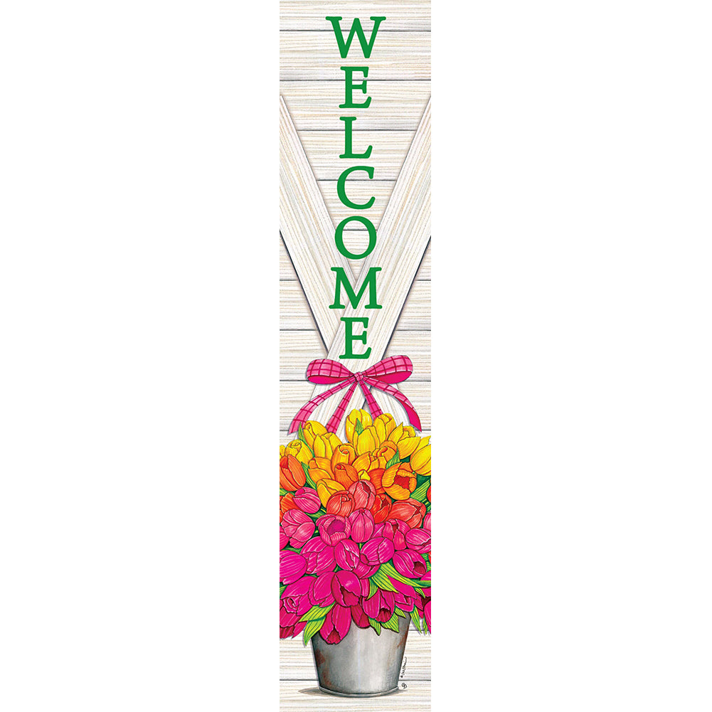 This Spring flag brings tulip pail charm! 🌷 Those vibrant tulips in rustic galvanized pail against wooden backdrop saying "Welcome Spring" create such elegant seasonal hospitality! ✨