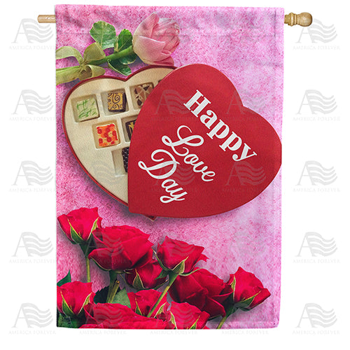 This "Happy Love Day" Valentine's flag is giving major romantic vibes! 🌹 Those beautiful red roses and heart-shaped chocolate box on a sweet pink background make this perfect for celebrating love. Such a charming design for Valentine's Day! 💕