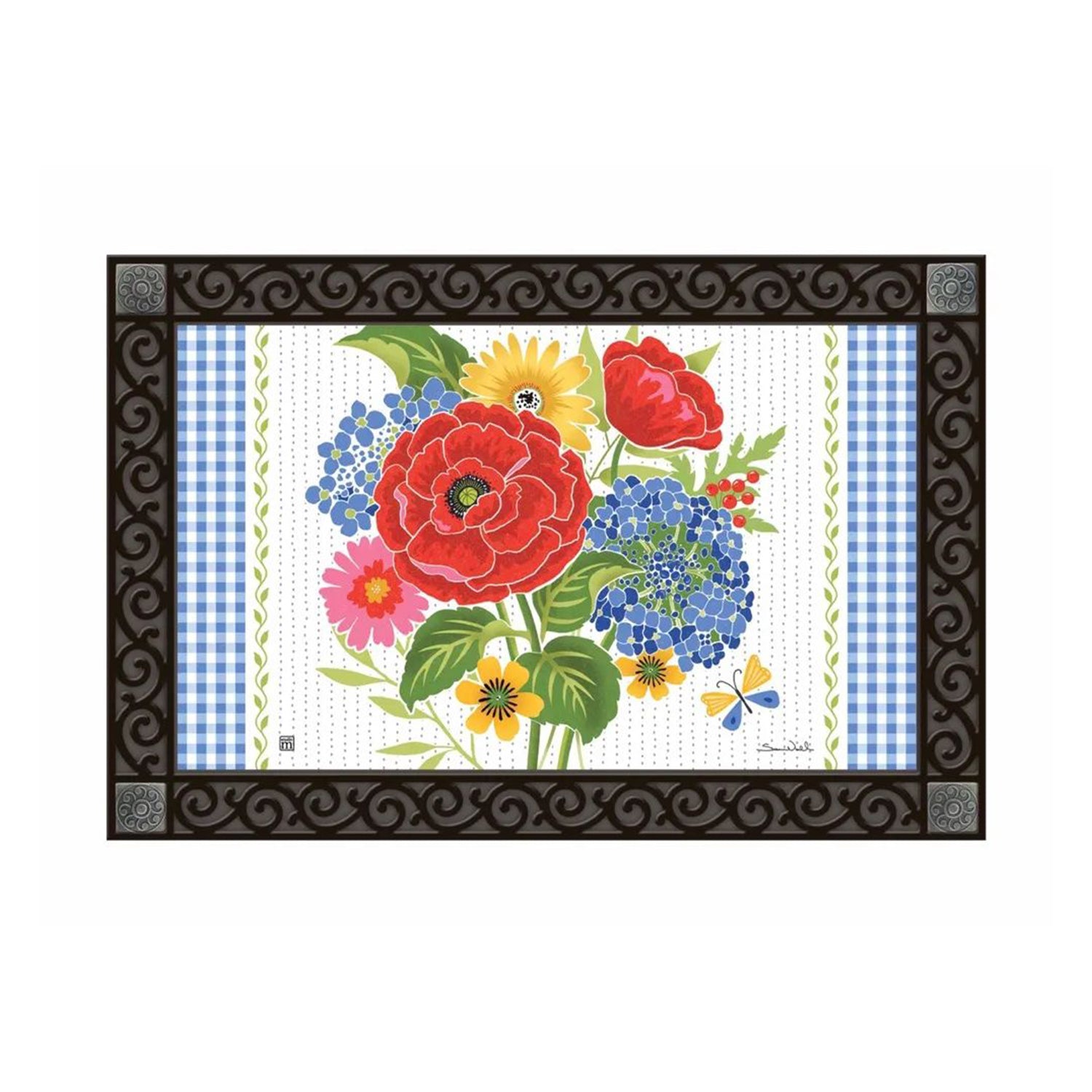 This cheerful farmhouse design features vibrant floral arrangement against patterned white background! 🌻 The blue and white checked border brings classic farmhouse style charm. Perfect country appeal! 🏠