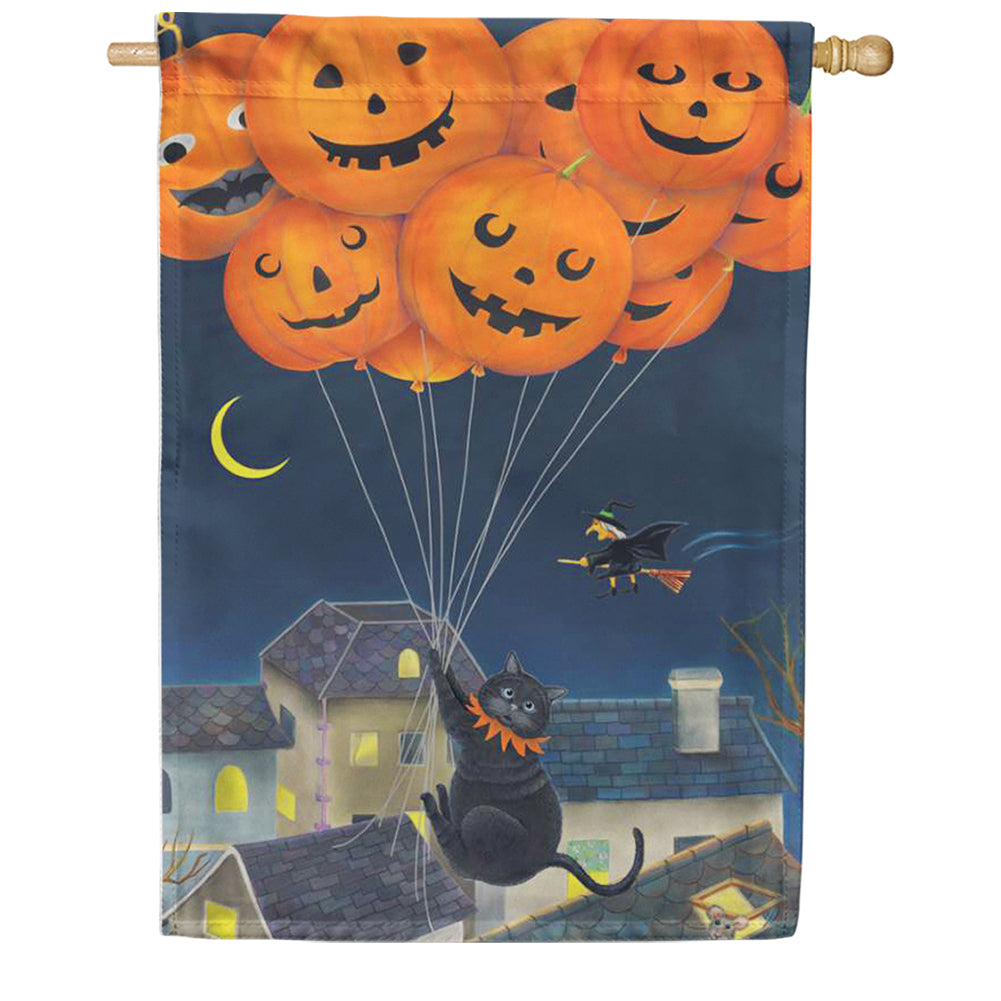 This Halloween design is so fun! 🐱 Featuring black cat flying over houses at night with pumpkin balloons and witch on broom brings such playful spooky vibes! 🎃