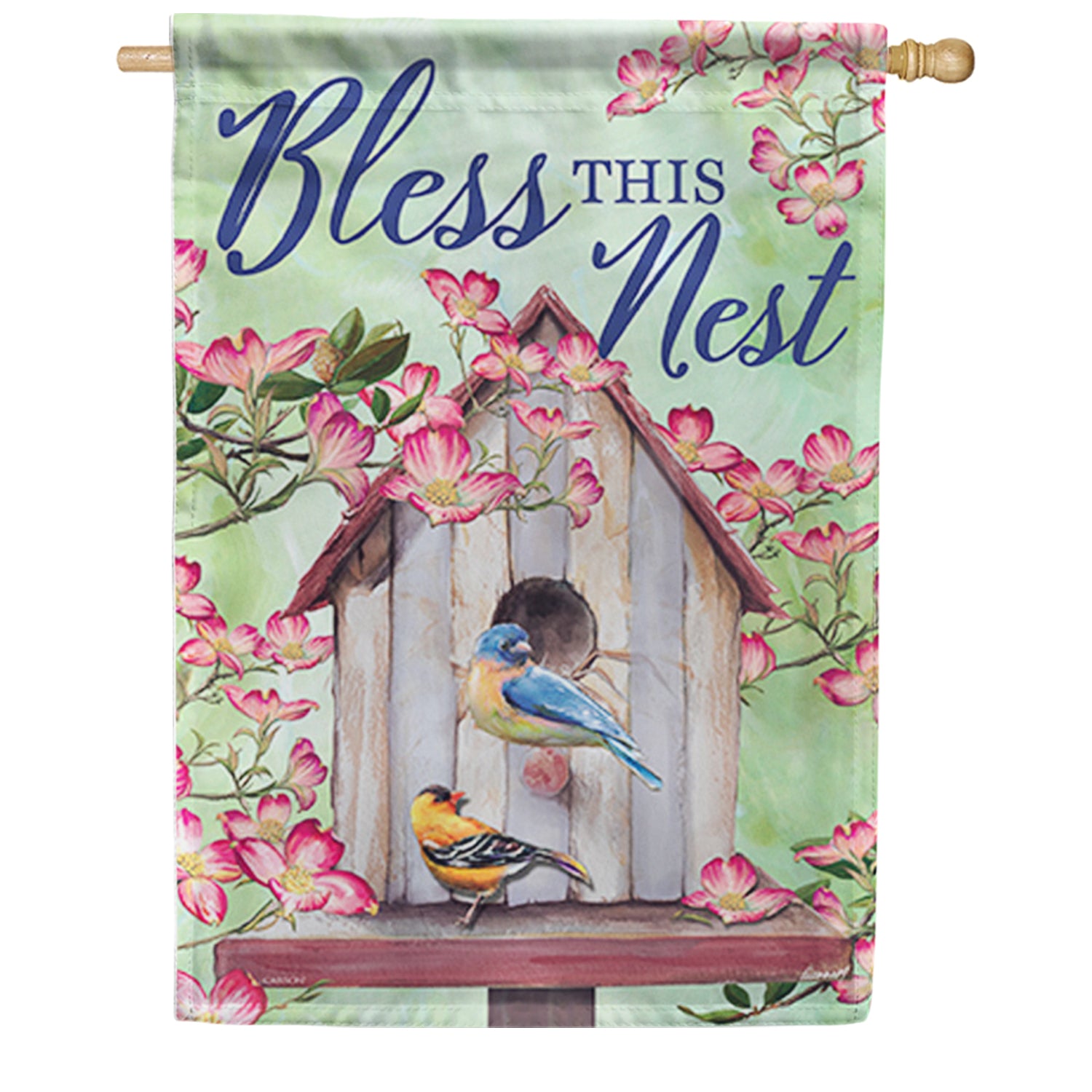 This Spring birdhouse scene is gorgeous! 🐦 Features a bluebird and goldfinch perched on birdhouse surrounded by vibrant dogwood blossoms saying "Bless this Nest". Such a lovely way to celebrate Spring's beauty! 🌸