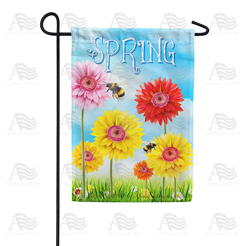 Get ready for this gorgeous spring garden scene! 🐝 A cheerful bee fluttering around pink, red, orange and yellow gerbera daisies with "SPRING" against that beautiful sky background. *chef's kiss* ☀️