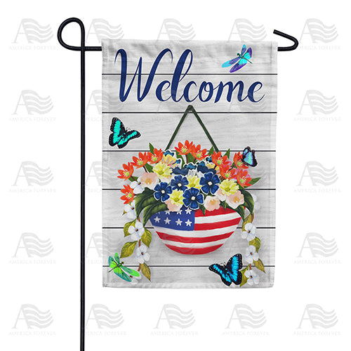 This patriotic "Welcome" flower vase design is gorgeous! 🌸 Butterflies and dragonflies around patriotic flowers in American flag vase on shiplap background. Perfect patriotic spring style! 🇺🇸